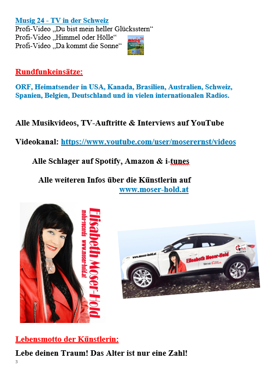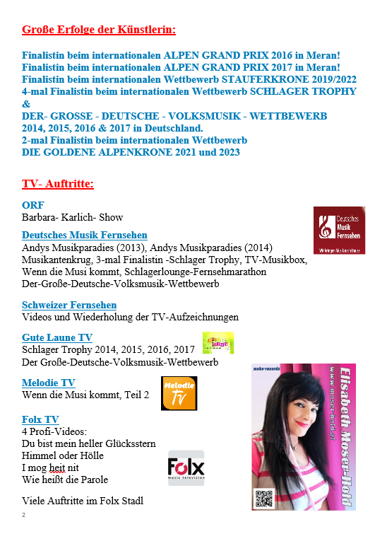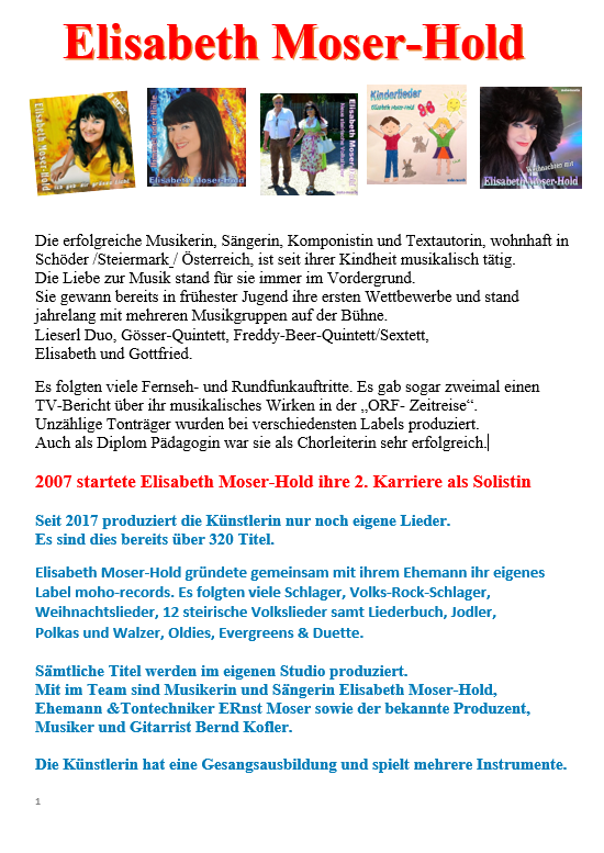 Diplom Pädagogin Elisabeth Moser-Hold war auch viele Jahre als Chorleiterin an der Volksschule Murau tätig und durfte mehrmals am Landesjugendsingen teilnehmen. Seit 2007 ist die Künstlerin auch als Schlagersängerin, Komponistin und Textautorin durch unzählige Rundfunk- und Fernsehauftritte bekannt. (ORF, Folx TV, Deutsches Musik Fernsehen, Gute Laune TV und musig24 / Schweiz. Ihre Lieder sind täglich in vielen internationalen Radios, sogar in den Heimatsendern von Kanada und USA im Einsatz. Sie durfte Österreich zweimal beim Alpen Grand Prix in Meran sowie beim internationalen Schlagerwettbewerb „Stauferkrone“ vertreten und sie gewann mit ihren Schlagern viele Hitparaden. Über 320 Schlager, Chansons, Oberkrainer-Lieder, Jodler, volkstümliche Lieder, Kinderlieder, Geschichten und neue steirische Volkslieder stammen aus ihrer Feder.
